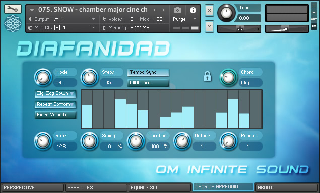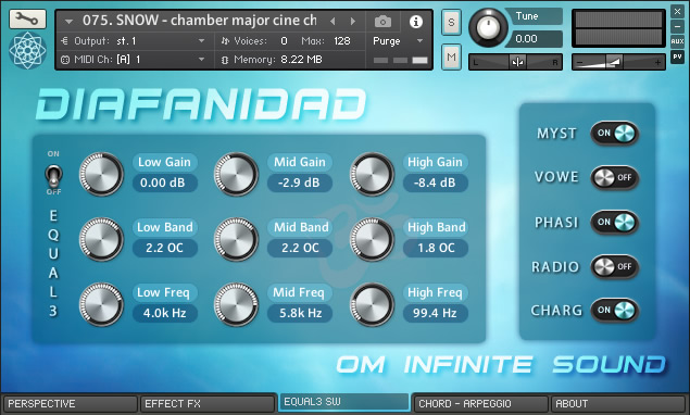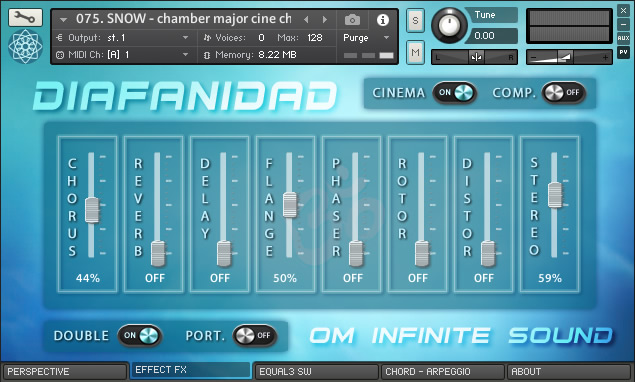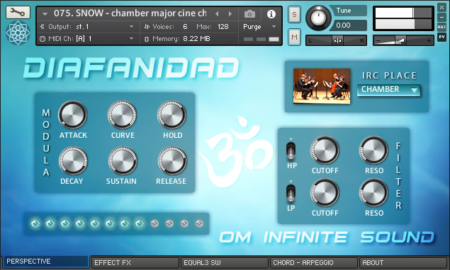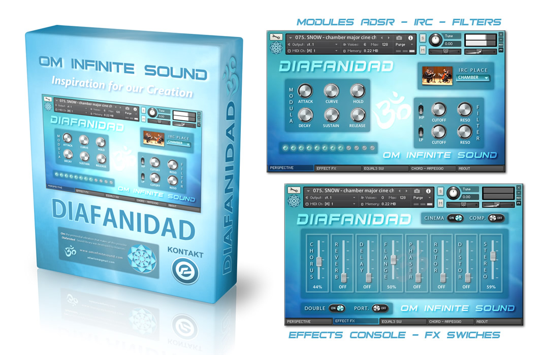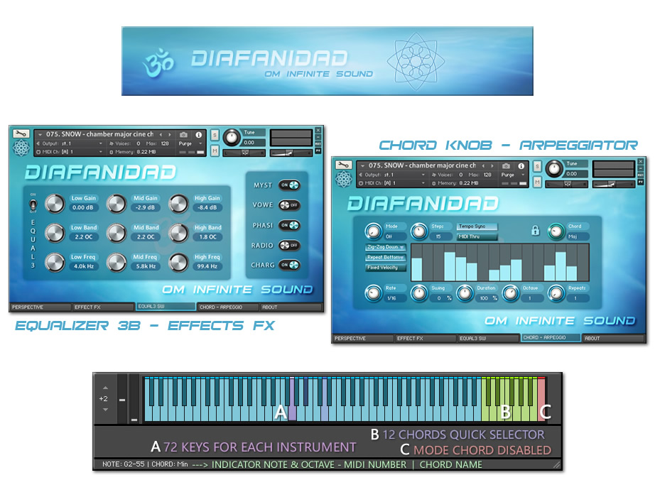 1. PERSPECTIVE: A. Selector spaces CONVOLUTION IRC. (Ambience, Orch Hall, Concert, Chamber, Arena, Plate, Space, Church, Cathedral, Room, Far Away, Reflection, Bright, Big Hall, Environment, Gold Plate, Long Hall, Park, Master, Cellar, Cave, Cosmic, Forest, Chapel, Distant, Cabinet & Infinite). B. ADSR signal module with knobs (Attack, Curve, Hold, Decay, Sustain & Release). C. Module for FILTERS activation or deactivation HP y LP with knobs (Cuttoff & Resonance). D. Indicator as Led simulator for VELOCITY level with MIDI controller. 2. EFFECTS FX: A. On/Off switch to apply CINEMA mode and On/Off switch for COMPRESSION. B. General EFFECTS console with sliders for level from 0 to 100% (Chorus, Reverb, Delay, Flanger, Phaser, Rotor, Distortion & Stereo). C. On/Off switch for DOUBLE VOICE and SW On/Off for applying PORTAMENTO. 3. EQUALIZER – SW: A. 3-Band EQ (Lows, Mids & Highs) with knobs for volume adjustments (Gain, Bandwidth & Frecuencies). B. Module with five Switches On/Off for new effects and special Kontakt processes (Choral Myst, Wovel, Phasis, Radio EQ & Super Charg). 4. CHORDS – ARP: A. ARPEGGIO module with variable parameters for (Mode, Steps, Order, Edge Repeat, Rate, Swing, Duration, Octaves & repeats). It also has a visual pattern from 2 to 32 columns, to adjust the velocity for each note. B. CHORD module contains a selector knob for 22 Chord types (Octave, 5th, 4th, 3rd, Major, Maj6, sus2, sus4, Maj7, Minor, Min6, Min7, Min7b5, Min + 7, Dom7, 7sus4, Dom9, Dim, Dim7, Aug, Chord1 & Chord2). It also contains a lock button. 🔒