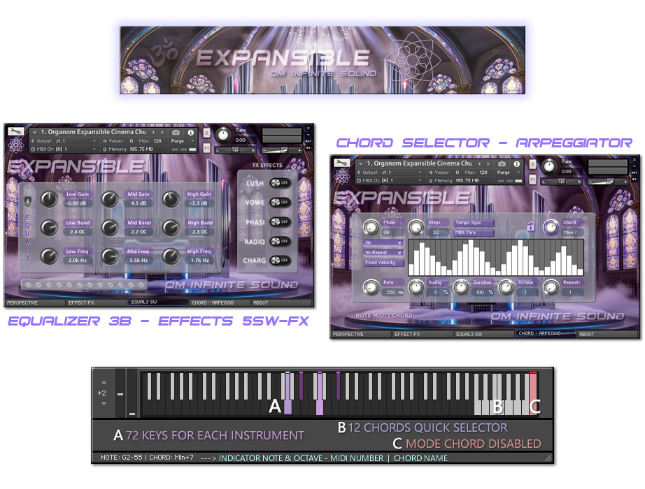 1. PERSPECTIVE: A. New selector menu for eight fast loading instruments. * Switch option to apply Amp Pro to the selected instrument. B. Space selector CONVOLUTION IRC. (AMBIENCE, ORCH HALL, CONCERT, CHAMBER, ARENA, PLATE, SPACE, CHURCH, CATHEDRAL, ROOM, FARAWAY, REFLECTION, BRIGHT, BIG HALL, ENVIRONMENT, GOLD PLATE, LONG HALL, THE PARK, MASTER, CELLAR, THE CAVE, COSMIC, FOREST, CHAPEL, DISTANT, CABINET & INFINITE). * New ten level control to apply the intensity of the IRC space. C. Module for activate or deactivate of HP and LP FILTERS with knobs for (CUT OFF & RESONANCE). D. Envelope ADSR module with knobs level number to apply (ATTACK, CURVE, HOLD, DECAY, SUSTAIN & RELEASE). 2. EFFECTS FX: A. ON/OFF switch to apply CINEMA mode and ON/OFF switch for COMPRESSION. B. General effects console with practical sliders for level from 0 to 100% (CHORUS, REVERB, DELAY, FLANGER, PHASER, ROTOR, DISTORTION and STEREO). C. ON/OFF switch for FORMANT and SW ON/OFF PORTAMENTO. 3. EQUALIZER – SW NEW EFFECTS: A. 3-Band Equalizer (LOWS, MIDS & HIGHS) with knobs for volume adjustments (GAIN, BANDWIDTH & FREQUENCIES). B. Module with five Switches ON/OFF for new effects and special Kontakt processes (LUSH PAD, WOVEL, PHASIS, RADIO EQ & SUPER CHARG) C. Indicator as LED simulator for VELOCITY level with the MIDI controller. 4. CHORDS – ARPEGGIATOR: A. ARPEGGIO module with variable parameters for (MODE, STEPS, ORDER, EDGE REPEAT, RATE, SWING, DURATION, OCTAVE & REPEATS). It also has a visual pattern from 2 to 32 columns, to adjust the velocity of each note. B. CHORD module contains a selector knob for 22 Chord types (Octave, 5th, 4th, 3rd, Major, Maj6, sus2, sus4, Maj7, Minor, Min6, Min7, Min7b5, Min+7, Dom7, 7sus4, Dom9, Dim, Dim7, Aug, ChordX & ChordY). It also contains a lock button. 🔒