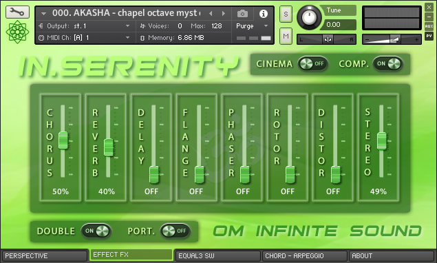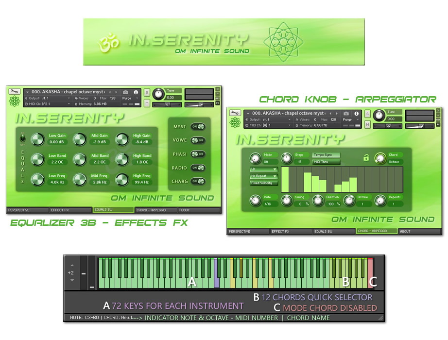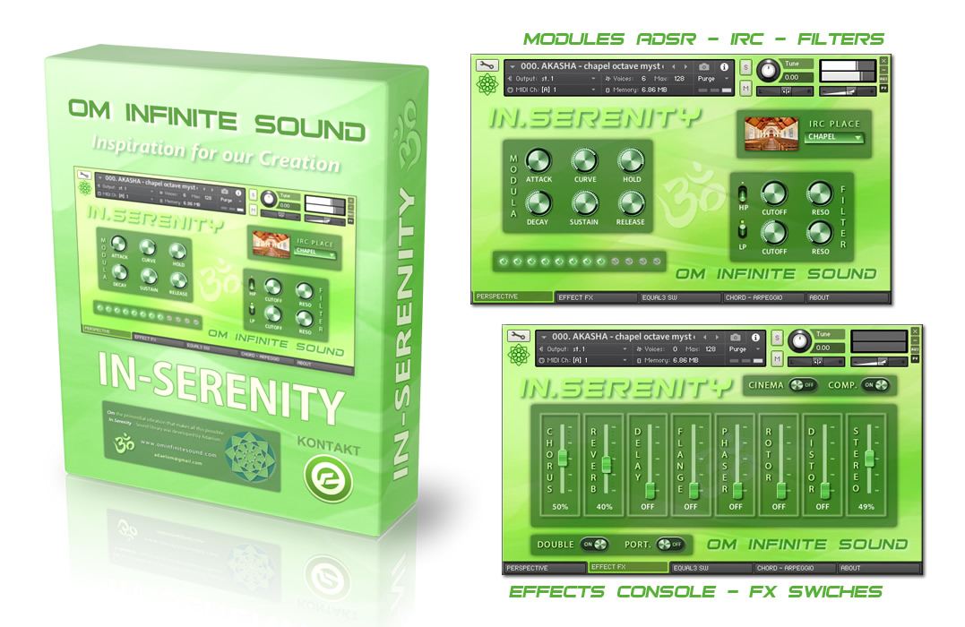 1. PERSPECTIVE: A. Selector spaces CONVOLUTION IRC. (Ambience, Orch Hall, Concert, Chamber, Arena, Plate, Space, Church, Cathedral, Room, Far Away, Reflection, Bright, Big Hall, Environment, Gold Plate, Long Hall, Park, Master, Cellar, Cave, Cosmic, Forest, Chapel, Distant, Cabinet & Infinite). B. ADSR signal module with knobs (Attack, Curve, Hold, Decay, Sustain & Release). C. Module for FILTERS activation or deactivation HP y LP with knobs (Cuttoff & Resonance). D. Indicator as Led simulator for VELOCITY level with MIDI controller. 2. EFFECTS FX: A. On/Off switch to apply CINEMA mode and On/Off switch for COMPRESSION. B. General EFFECTS console with sliders for level from 0 to 100% (Chorus, Reverb, Delay, Flanger, Phaser, Rotor, Distortion & Stereo). C. On/Off switch for DOUBLE VOICE and SW On/Off for applying PORTAMENTO. 3. EQUALIZER – SW: A. 3-Band EQ (Lows, Mids & Highs) with knobs for volume adjustments (Gain, Bandwidth & Frecuencies). B. Module with five Switches On/Off for new effects and special Kontakt processes (Choral Myst, Wovel, Phasis, Radio EQ & Super Charg). 4. CHORDS – ARP: A. ARPEGGIO module with variable parameters for (Mode, Steps, Order, Edge Repeat, Rate, Swing, Duration, Octaves & repeats). It also has a visual pattern from 2 to 32 columns, to adjust the velocity for each note. B. CHORD module contains a selector knob for 22 Chord types (Octave, 5th, 4th, 3rd, Major, Maj6, sus2, sus4, Maj7, Minor, Min6, Min7, Min7b5, Min + 7, Dom7, 7sus4, Dom9, Dim, Dim7, Aug, Chord1 & Chord2). It also contains a lock button. 🔒
