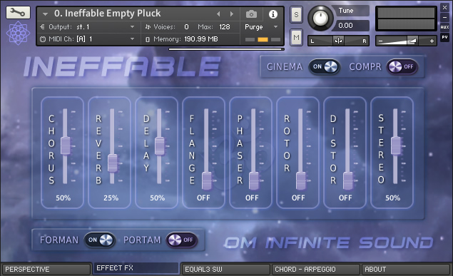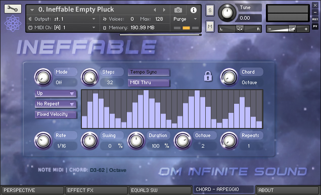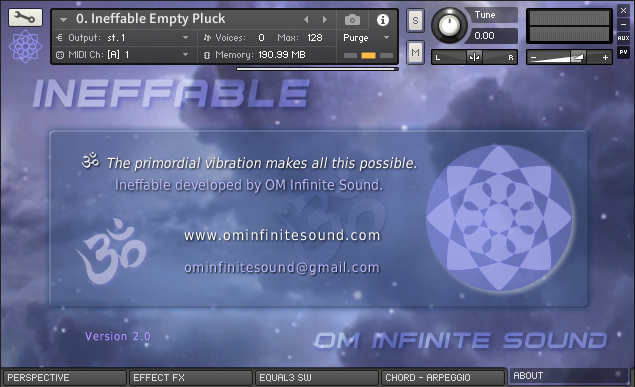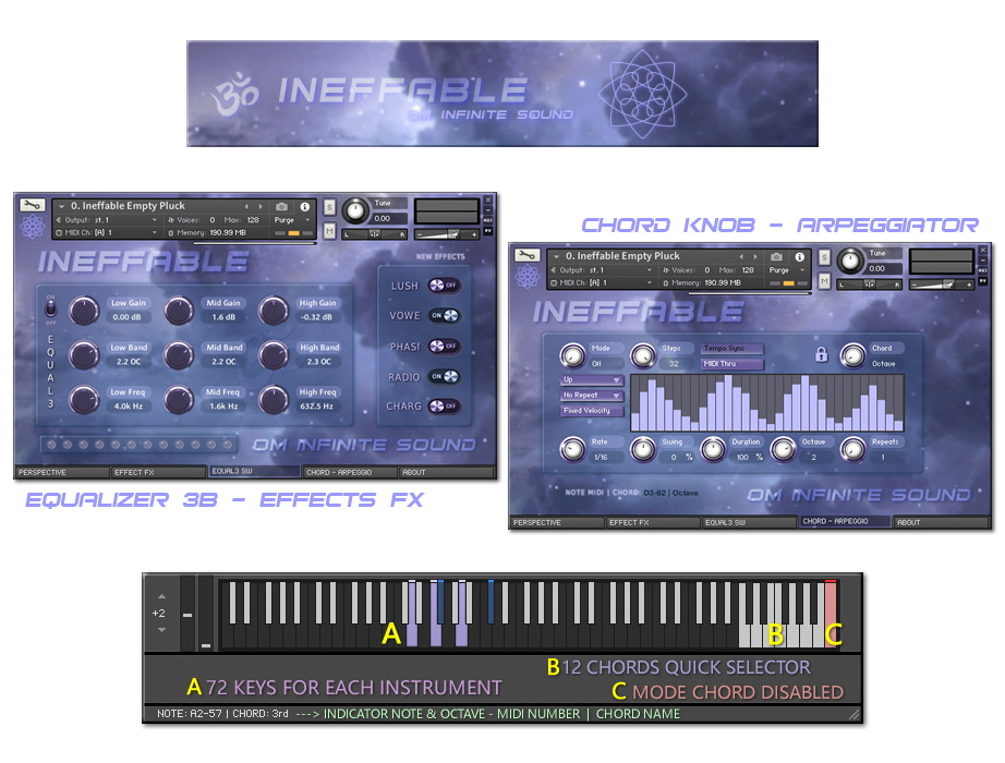 ॐ INEFFABLE is a KONTAKT library specially designed with organic and electronic sounds (8) special instruments to inspire and recreate great compositions. Samples with great sound quality and light and fast loading, allow you to add a greater number of instruments without consuming too many resources. With a classic and intuitive interface that is easy to use, it has the necessary tools for expert or beginner level musicians to customize the instruments into great sounds. LIBRARY SPECS: • 8 sample instruments 1.22 GB installed, total 592 files. • 576 NCW samples with Stereo sound and depth of 32 Bits / 48 kHz. • 27 IRC Convolution environments to recreate impressive real spaces. • New ten level slider to apply the intensity of the IRC space. • Keyboard with 72 notes and partition for application of main chords. • ADSR modules and LP and HP filters. Various effects console and Arp. • Quick load selector menu for eight instruments and a new Pro Amp. • Switches to apply Compression, Cinema mode, new switch Formant and algorithm to emulate Portamento. • 3-Band Equalizer and Switches for new Effects and audio processes. • Twenty-two chord selector knob with midi note pressed indicator. REQUIREMENTS: • Windows 10, macOS 10 or later. • Core Intel I3 or AMD Ryzen 3 or higher. • 20 GB of minimum capacity in HDD ideal SSD. • 8 GB RAM memory, 16 GB recommended. • Native Instruments Full Kontakt version 6.7.0 • Too much Creativity and Inspiration.😊