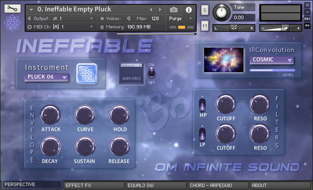 1. PERSPECTIVE: A. New selector menu for eight fast loading instruments. * Switch option to apply Amp Pro to the selected instrument. B. Space selector CONVOLUTION IRC. (AMBIENCE, ORCH HALL, CONCERT, CHAMBER, ARENA, PLATE, SPACE, CHURCH, CATHEDRAL, ROOM, FARAWAY, REFLECTION, BRIGHT, BIG HALL, ENVIRONMENT, GOLD PLATE, LONG HALL, THE PARK, MASTER, CELLAR, THE CAVE, COSMIC, FOREST, CHAPEL, DISTANT, CABINET & INFINITE). * New ten level control to apply the intensity of the IRC space. C. Module for activate or deactivate of HP and LP FILTERS with knobs for (CUT OFF & RESONANCE). D. Envelope ADSR module with knobs level number to apply (ATTACK, CURVE, HOLD, DECAY, SUSTAIN & RELEASE). 2. EFFECTS FX: A. ON/OFF switch to apply CINEMA mode and ON/OFF switch for COMPRESSION. B. General effects console with practical sliders for level from 0 to 100% (CHORUS, REVERB, DELAY, FLANGER, PHASER, ROTOR, DISTORSION and STEREO). C. ON/OFF switch for FORMANT and SW ON/OFF PORTAMENTO. 3. EQUALIZER – SW NEW EFFECTS: A. 3-Band Equalizer (LOWS, MIDS & HIGHS) with knobs for volume adjustments (GAIN, BANDWIDTH & FREQUENCIES). B. Module with five Switches ON/OFF for new effects and special Kontakt processes (LUSH PAD, WOVEL, PHASIS, RADIO EQ & SUPER CHARG) C. Indicator as LED simulator for VELOCITY level with the MIDI controller. 4. CHORDS – ARPEGGIATOR: A. ARPEGGIO module with variable parameters for (MODE, STEPS, ORDER, EDGE REPEAT, RATE, SWING, DURATION, OCTAVE & REPEATS). It also has a visual pattern from 2 to 32 columns, to adjust the velocity of each note. B. CHORD module contains a selector knob for 22 Chord types (Octave, 5th, 4th, 3rd, Major, Maj6, sus2, sus4, Maj7, Minor, Min6, Min7, Min7b5, Min+7, Dom7, 7sus4, Dom9, Dim, Dim7, Aug, ChordX & ChordY). It also contains a lock button 🔒