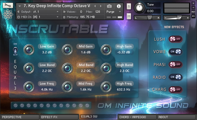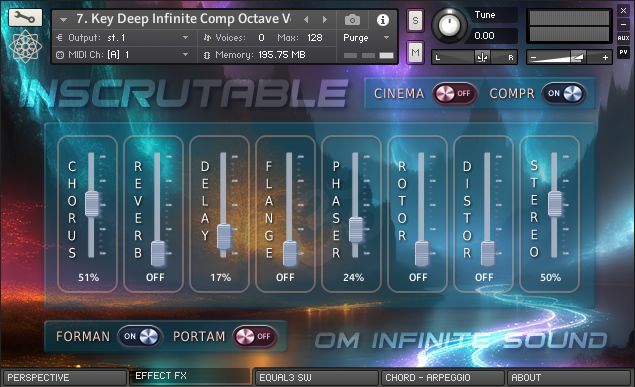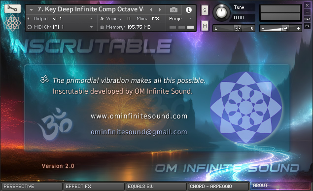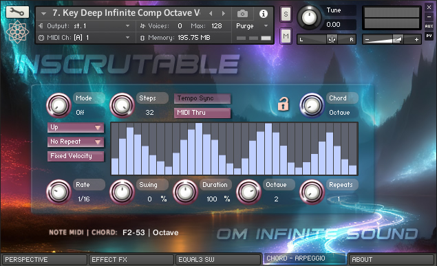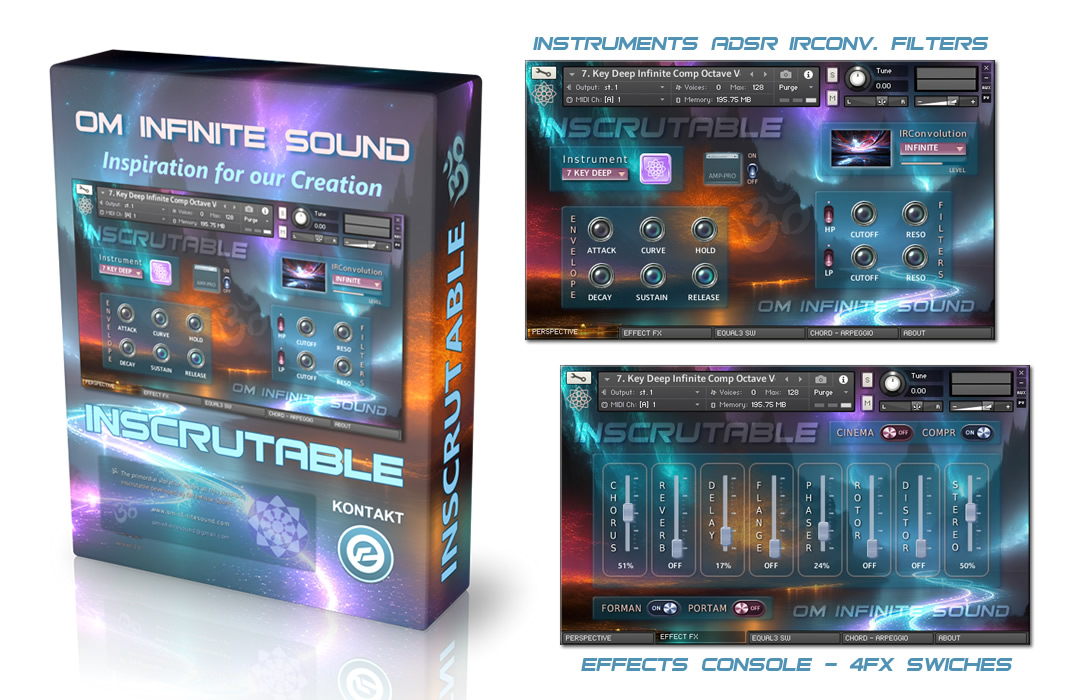 ॐ INSCRUTABLE is a KONTAKT library specially designed with organic and electronic sounds (8) special instruments to inspire and recreate great compositions. Samples with great sound quality and light and fast loading, allow you to add a greater number of instruments without consuming too many resources. With fantastic, classic and intuitive interface that is easy to use, it has the necessary tools for expert or beginner level musicians to customize the instruments into great sounds. LIBRARY SPECS: • 8 sample instruments 2.24 GB installed, total 593 files. • 576 NCW samples with Stereo sound and depth of 32 Bits / 48 kHz. • 27 IRC Convolution environments to recreate impressive real spaces. • New ten level slider to apply the intensity of the IRC space. • Keyboard with 72 notes and partition for application of main chords. • ADSR modules and LP and HP filters. Various effects console and Arp. • Quick load selector menu for eight instruments and a new Pro Amp. • Switches to apply Compression, Cinema mode, new switch Formant and algorithm to emulate Portamento. • 3-Band Equalizer and Switches for new Effects and audio processes. • Twenty-two chord selector knob with midi note pressed indicator. REQUIREMENTS: • Windows 10, macOS 10 or later. • Core Intel I3 or AMD Ryzen 3 or higher. • 20 GB of minimum capacity in HDD ideal SSD. • 8 GB RAM memory, 16 GB recommended. • Native Instruments Full Kontakt version 6.7.0 • Too much Creativity and Inspiration.😊
