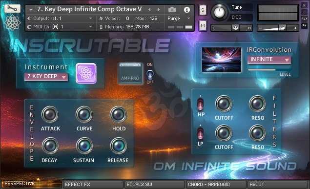 1. PERSPECTIVE: A. New selector menu for eight fast loading instruments. * Switch option to apply Amp Pro to the selected instrument. B. Space selector CONVOLUTION IRC. (AMBIENCE, ORCH HALL, CONCERT, CHAMBER, ARENA, PLATE, SPACE, CHURCH, CATHEDRAL, ROOM, FARAWAY, REFLECTION, BRIGHT, BIG HALL, ENVIRONMENT, GOLD PLATE, LONG HALL, THE PARK, MASTER, CELLAR, THE CAVE, COSMIC, FOREST, CHAPEL, DISTANT, CABINET & INFINITE). * New ten level control to apply the intensity of the IRC space. C. Module for activate or deactivate of HP and LP FILTERS with knobs for (CUT OFF & RESONANCE). D. Envelope ADSR module with knobs level number to apply (ATTACK, CURVE, HOLD, DECAY, SUSTAIN & RELEASE). 2. EFFECTS FX: A. ON/OFF switch to apply CINEMA mode and ON/OFF switch for COMPRESSION. B. General effects console with practical sliders for level from 0 to 100% (CHORUS, REVERB, DELAY, FLANGER, PHASER, ROTOR, DISTORSION and STEREO). C. ON/OFF switch for FORMANT and SW ON/OFF PORTAMENTO. 3. EQUALIZER – SW NEW EFFECTS: A. 3-Band Equalizer (LOWS, MIDS & HIGHS) with knobs for volume adjustments (GAIN, BANDWIDTH & FREQUENCIES). B. Module with five Switches ON/OFF for new effects and special Kontakt processes (LUSH PAD, WOVEL, PHASIS, RADIO EQ & SUPER CHARG) C. Indicator as LED simulator for VELOCITY level with the MIDI controller. 4. CHORDS – ARPEGGIATOR: A. ARPEGGIO module with variable parameters for (MODE, STEPS, ORDER, EDGE REPEAT, RATE, SWING, DURATION, OCTAVE & REPEATS). It also has a visual pattern from 2 to 32 columns, to adjust the velocity of each note. B. CHORD module contains a selector knob for 22 Chord types (Octave, 5th, 4th, 3rd, Major, Maj6, sus2, sus4, Maj7, Minor, Min6, Min7, Min7b5, Min+7, Dom7, 7sus4, Dom9, Dim, Dim7, Aug, ChordX & ChordY). It also contains a lock button 🔒