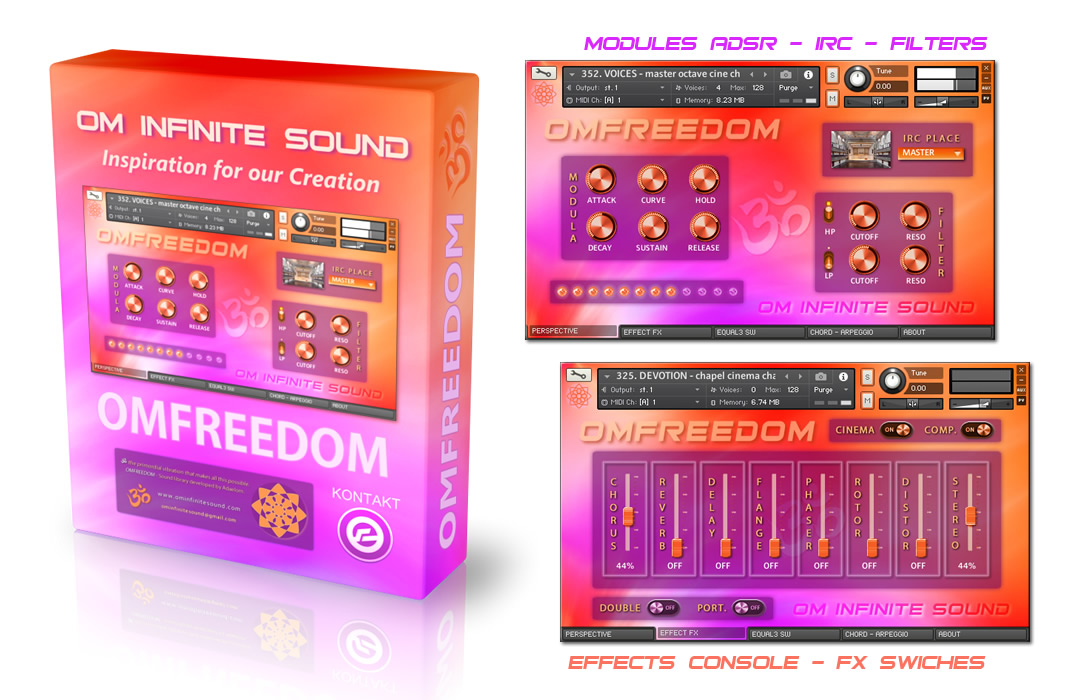 PACK INSTRUMENTS: 01. STRINGS – Fabulous and powerful string ensemble. 02. YINYANG – Pluck Zen for an evocative oriental sound. 03. BOWLOM – Meditation Bowls with Synthesizer Pad. 04. CLAVECIN – Great Harpsichord, baroque and classical. 05. DEVOTION – Wonderful Fluted-timbre Chapel Organ. 06. PADMAA – Nice and special Harp with surround sound. 07. BANSURI – Transcendental Bansuri, natural wind tunes. 08. VOICES – Ensemble of organic and synthesized Chorus.
