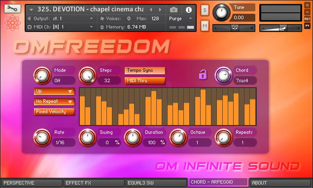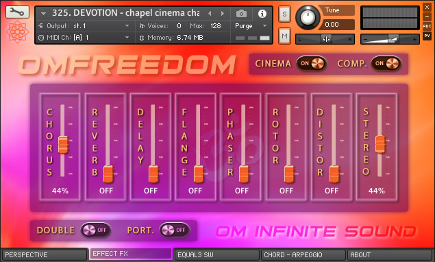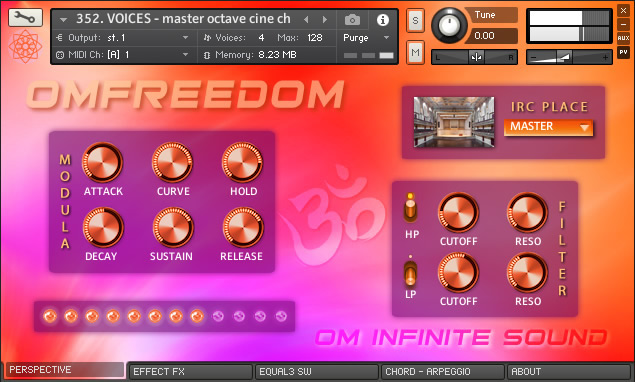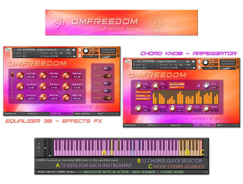 1. PERSPECTIVE: A. Selector spaces CONVOLUTION IRC. (Ambience, Orch Hall, Concert, Chamber, Arena, Plate, Space, Church, Cathedral, Room, Far Away, Reflection, Bright, Big Hall, Environment, Gold Plate, Long Hall, Park, Master, Cellar, Cave, Cosmic, Forest, Chapel, Distant, Cabinet & Infinite). B. ADSR signal module with knobs (Attack, Curve, Hold, Decay, Sustain & Release). C. Module for FILTERS activation or deactivation HP y LP with knobs (Cuttoff & Resonance). D. Indicator as Led simulator for VELOCITY level with MIDI controller. 2. EFFECTS FX: A. On/Off switch to apply CINEMA mode and On/Off switch for COMPRESSION. B. General EFFECTS console with sliders for level from 0 to 100% (Chorus, Reverb, Delay, Flanger, Phaser, Rotor, Distortion & Stereo). C. On/Off switch for DOUBLE VOICE and SW On/Off for applying PORTAMENTO. 3. EQUALIZER – SW: A. 3-Band EQ (Lows, Mids & Highs) with knobs for volume adjustments (Gain, Bandwidth & Frecuencies). B. Module with five Switches On/Off for new effects and special Kontakt processes (Choral Myst, Wovel, Phasis, Radio EQ & Super Charg). 4. CHORDS – ARP: A. ARPEGGIO module with variable parameters for (Mode, Steps, Order, Edge Repeat, Rate, Swing, Duration, Octaves & repeats). It also has a visual pattern from 2 to 32 columns, to adjust the velocity for each note. B. CHORD module contains a selector knob for 22 Chord types (Octave, 5th, 4th, 3rd, Major, Maj6, sus2, sus4, Maj7, Minor, Min6, Min7, Min7b5, Min + 7, Dom7, 7sus4, Dom9, Dim, Dim7, Aug, Chord1 & Chord2). It also contains a lock button. 🔒