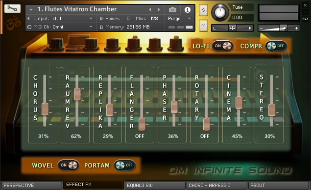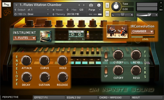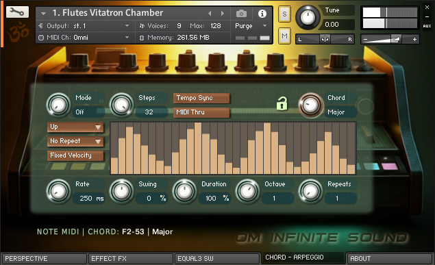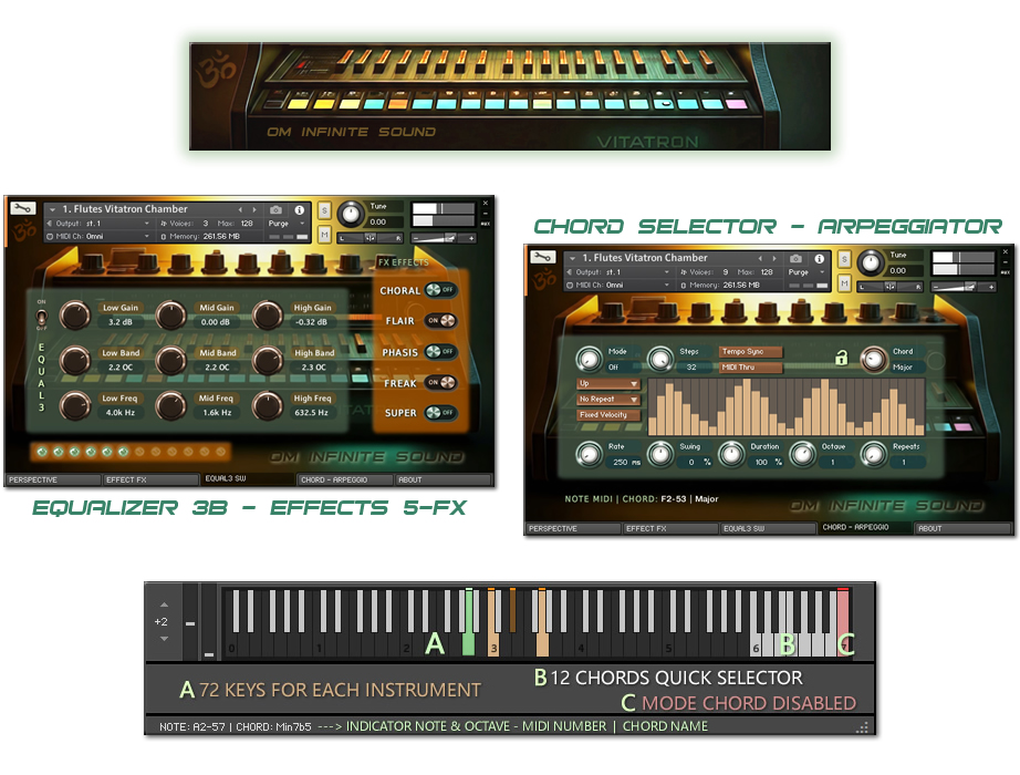 1. PERSPECTIVE: A. New selector menu for (8) eight quick-loading instruments. B. CONVOLUTION IRC real space selector. (AMBIENCE, ORCH HALL, CONCERT, CHAMBER, ARENA, PLATE, SPACE, CHURCH, CATHEDRAL, ROOM, FARAWAY, REFLECTION, BRIGHT, BIG HALL, ENVIRONMENT, GOLD PLATE, LONG HALL, THE PARK, MASTER, CELLAR, THE CAVE, COSMIC, FOREST, CHAPEL, DISTANT, CABINET & INFINITE). Note: The EMPTY option does not apply any IRConvolution. New 10-level LEVEL control to apply the intensity of the IRC spaces. C. Module to activate or deactivate HP High Pass and LP Low Pass Filters. D. ADSR Envelope with knobs (ATTACK, CURVE, HOLD, DECAY, SUSTAIN, RELEASE). 2. EFFECTS FX: A. ON/OFF switch for LO-FI mode and ON/OFF switch for COMPRESSION. B. General effects console with handy level sliders from 0 to 100% (CHORUS, RAUMREV, REPLIKA, FLANGER, PHASER, ROTARY, CINEMA and STEREO). C. ON/OFF switch for WOVEL and ON/OFF switch for PORTAMENTO. 3. EQUALIZER – SW EFFECTS: A. 3-band equalizer (LOWS, MIDS & HIGHS) with level knobs. B. Module with five ON/OFF switches for new effects and special Kontakt processes (CHORAL, FLAIR, PHASIS, FREAK & SUPER CHARG). C. LED indicator as a simulator for VELOCITY level with the MIDI controller. 4. CHORDS – ARPEGGIATOR: A. ARPEGGIO module with variable parameters for (MODE, STEPS, ORDER, EDGE REPEAT, RATE, SWING, DURATION, OCTAVE & REPEATS). It also features a 2 to 32 column visual pattern, to adjust the speed of each note. B. CHORD contains a selection knob for 22 presets chords. (Octave, 5th, 4th, 3rd, Major, Maj6, sus2, sus4, Maj7, Minor, Min6, Min7, Min7b5, Min+7, Dom7, 7sus4, Dom9, Dim, Dim7, Aug, ChordX & ChordY). 🔒 Lock button applies the function of locking the chord selection.