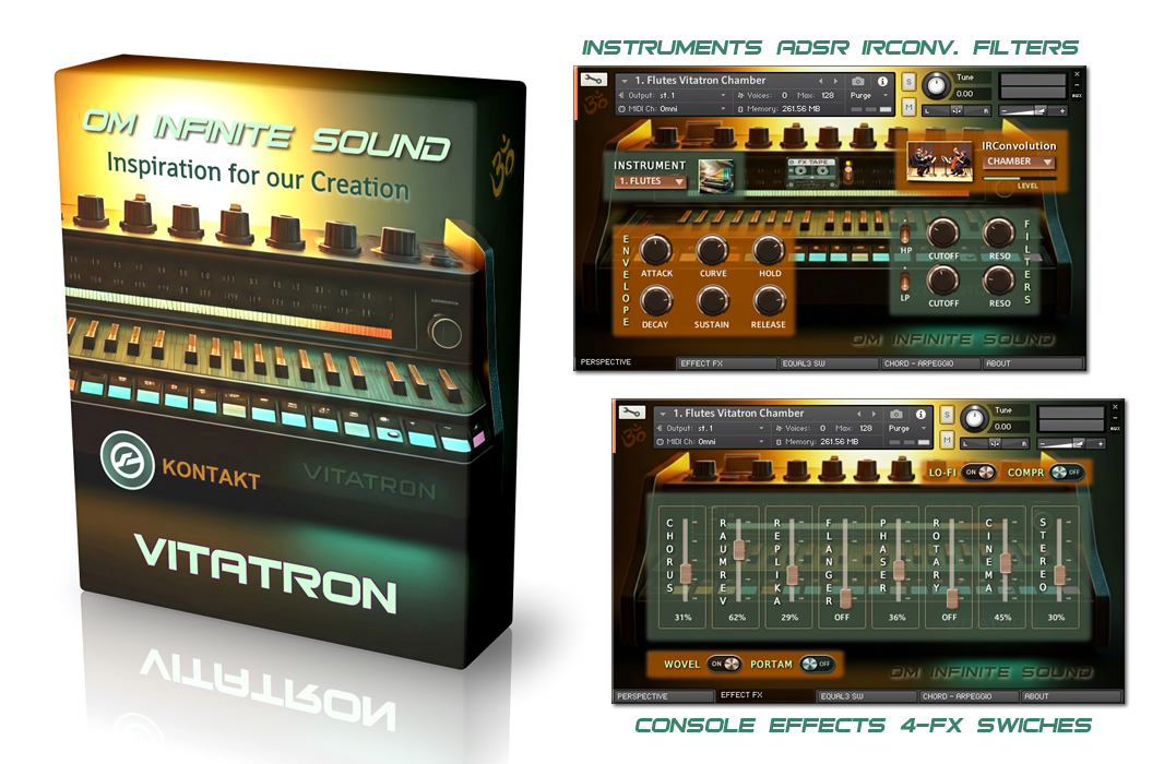 Vitatron special instrument library Kontakt, inspired by the acclaimed old glorious sounds of the Mellotron. With 8 instruments (Flutes, Choirs, Rodhes, Strings, Synths, Winds, Brass and Organs) framed with that warm, nostalgic tape sound, Vitatron becomes a gem for lovers of retro sound. Meticulously designing each instrument with samples from analog and digital sources that result in that warm, dreamy age-old sound.